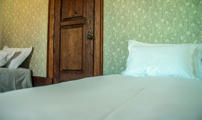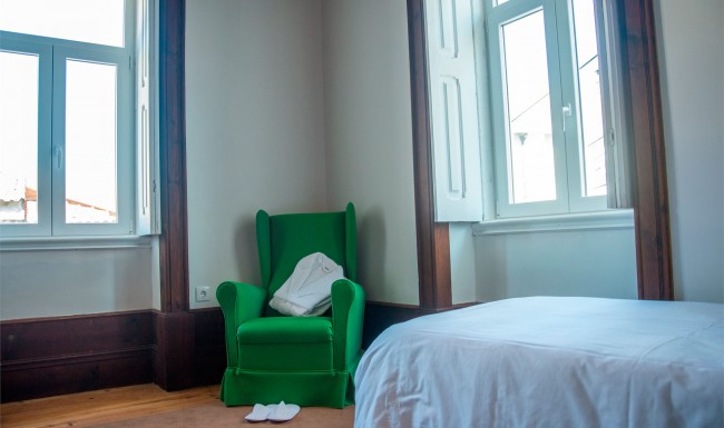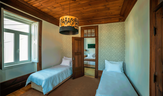 Quarto familiar, onde as cores e os tons convidam ao descanso, onde os verdes e os cinzas dominam. Concebido de forma a permitir a privacidade dos seus ocupantes, com facilidade de acesso entre si.
